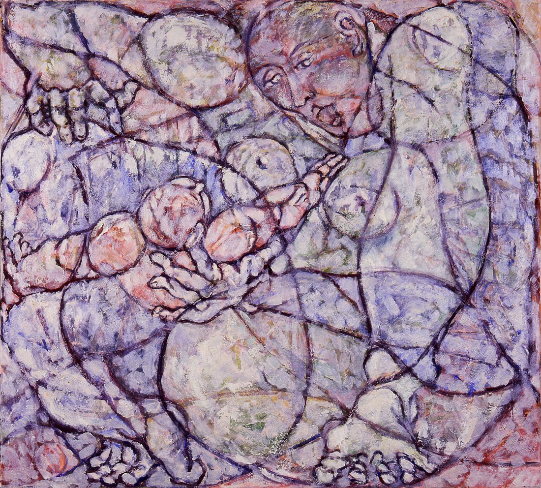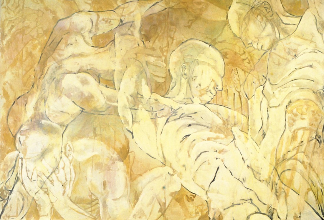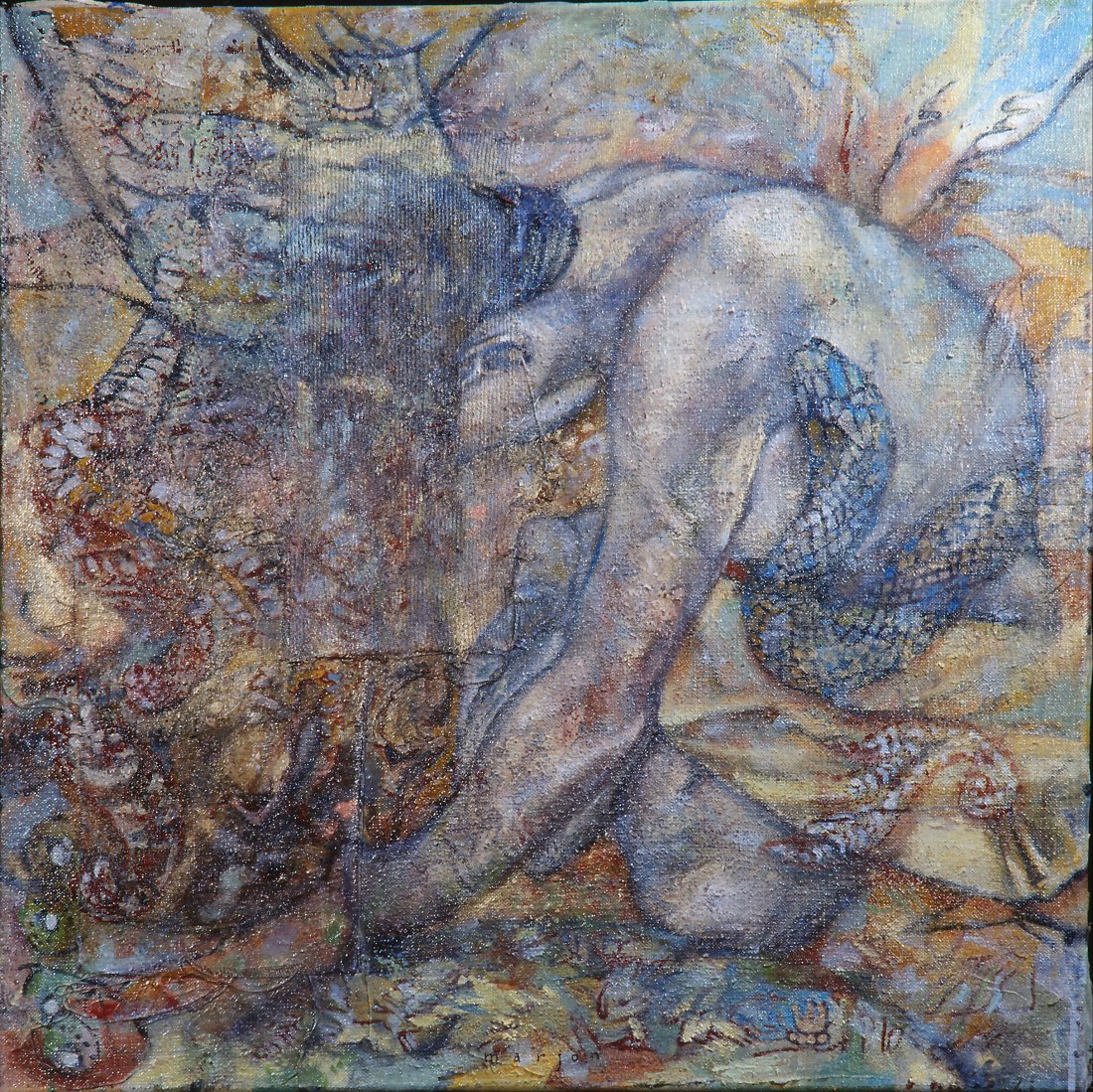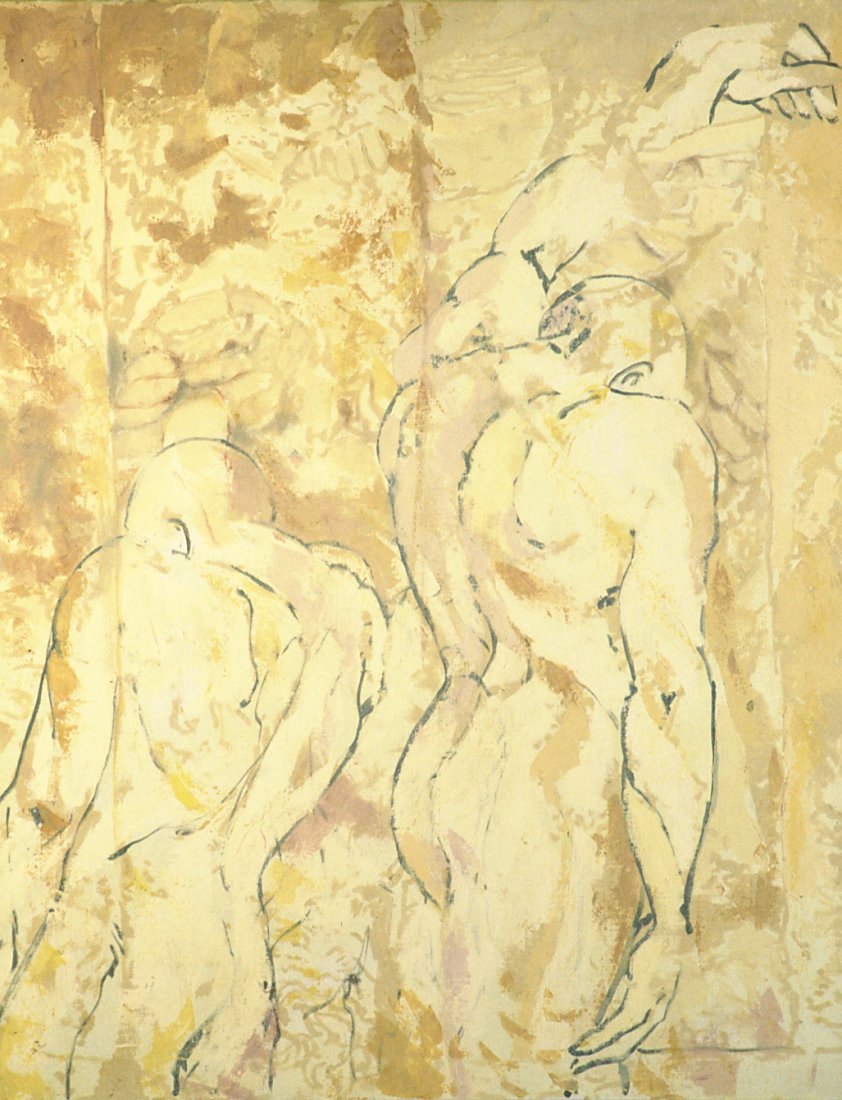 in the series of abstract paintings with the oval and round organic shapes the human body is still central, but it gets a strong radiation by the use of aquarellistic colours and compact shape.