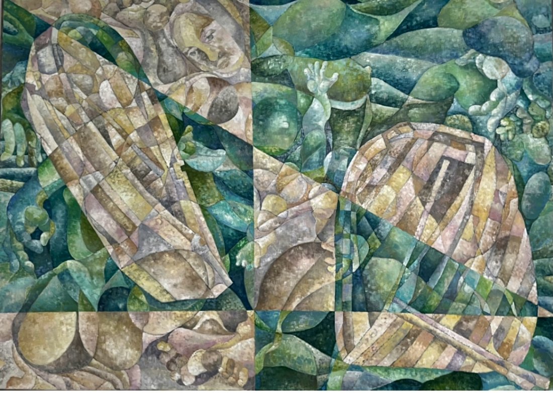 the bodies of women from which new life arises seem to float directly under a crystal clear watersurface shone upon by the sun.