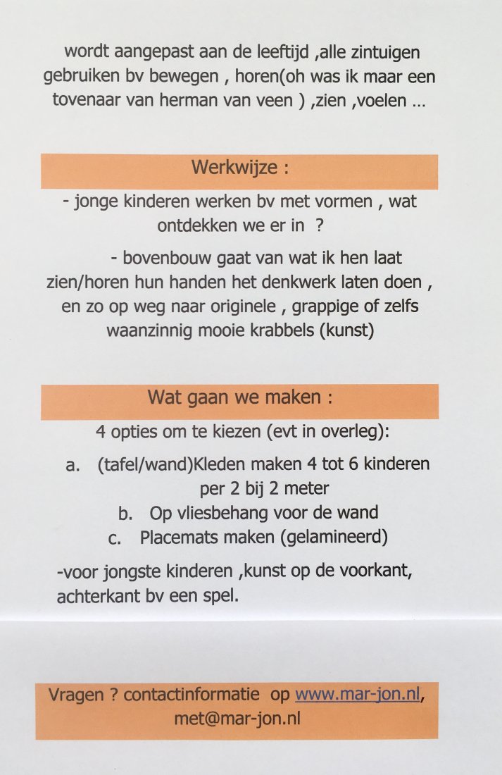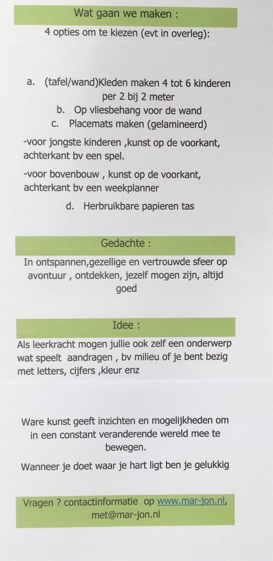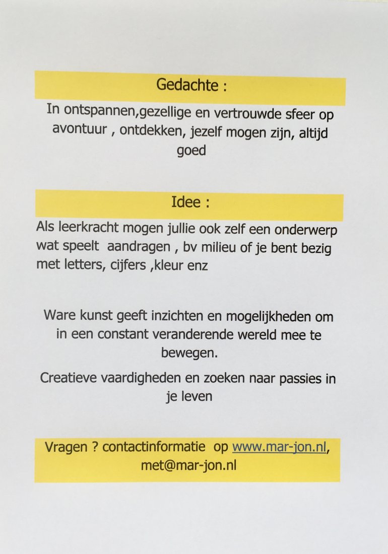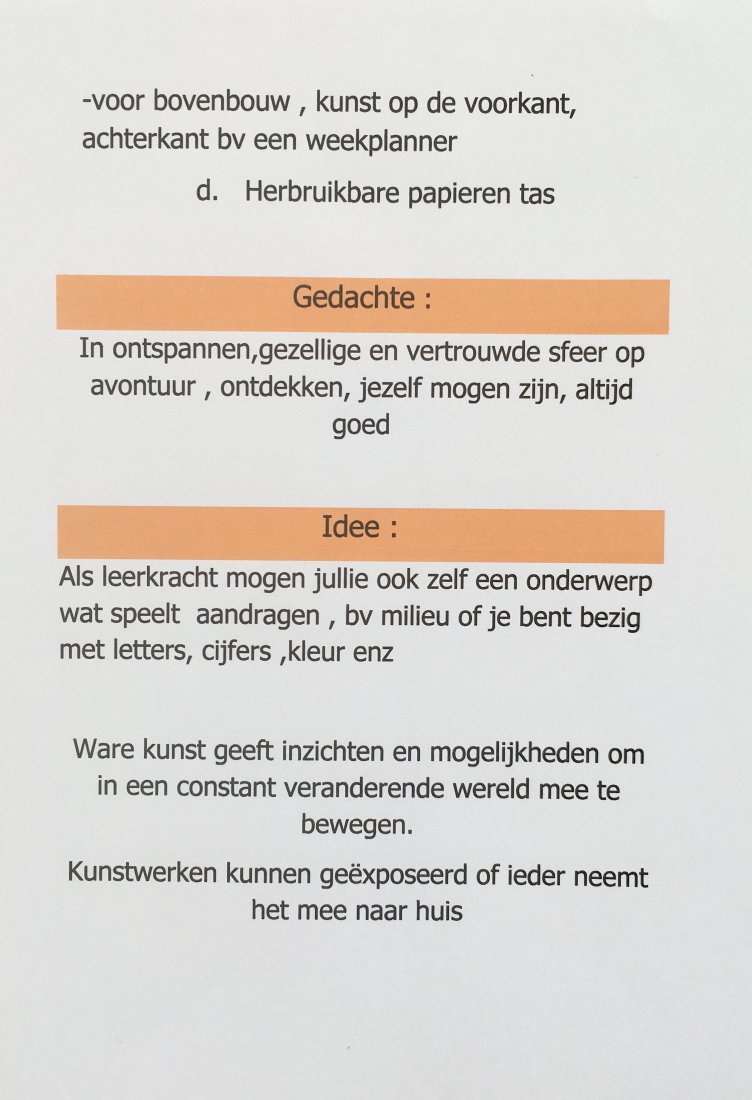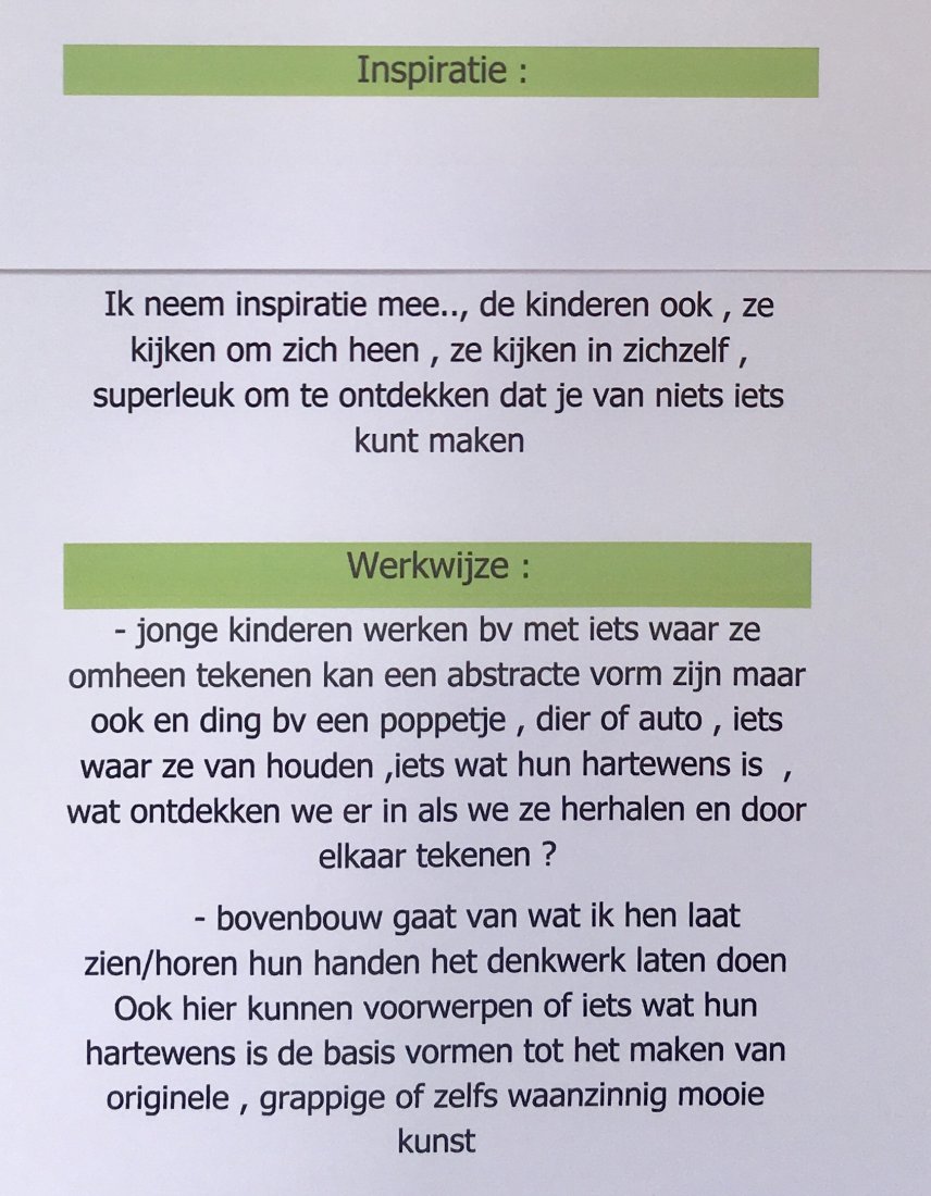 gedachte / werkwijze : inspirend materiaal , wat krijgen we mee, wat zouden we kunnen zijn ..., voorbeelden maken en aan de slag met het neergelegde matriaal , persoonlijke begeleiding