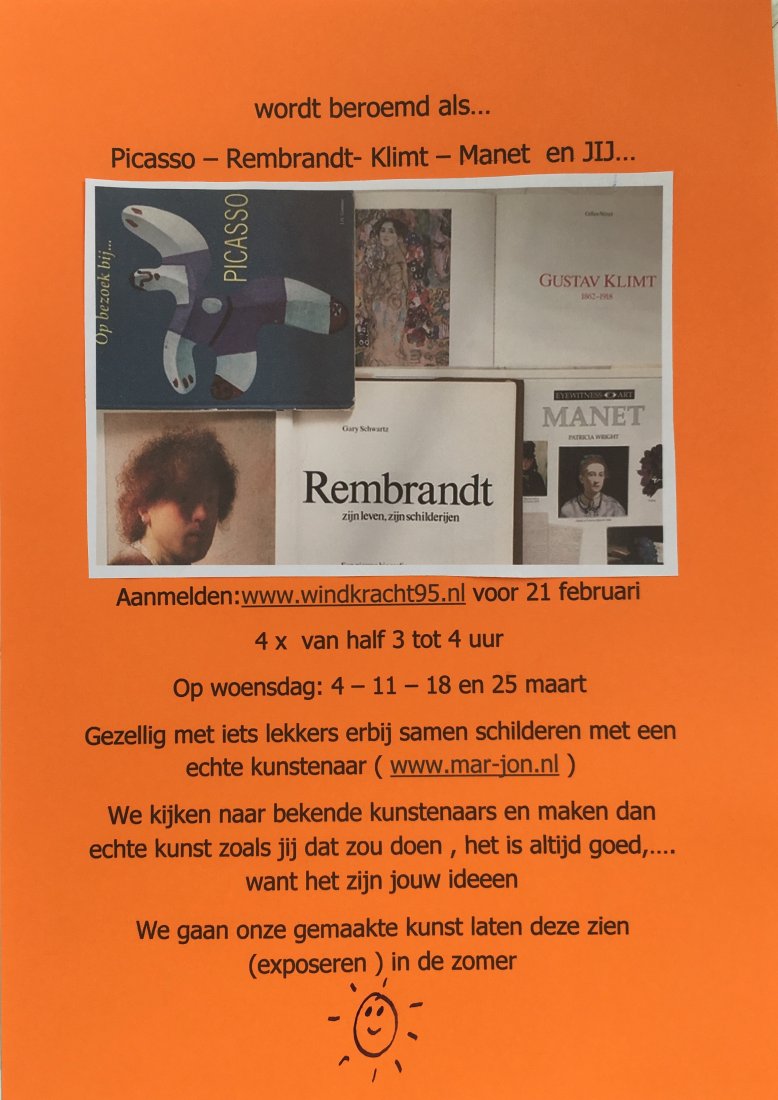 tijd : 2 uur : inclusief verzorging,voorbereiding , kunstles geven, opruimen en materiaal