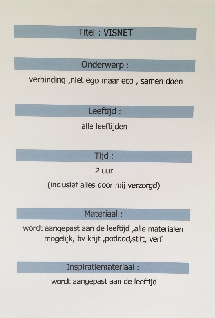tijd : 2 uur : inclusief verzorging , voorbereiding , kunstles geven ,opruimen en materiaal