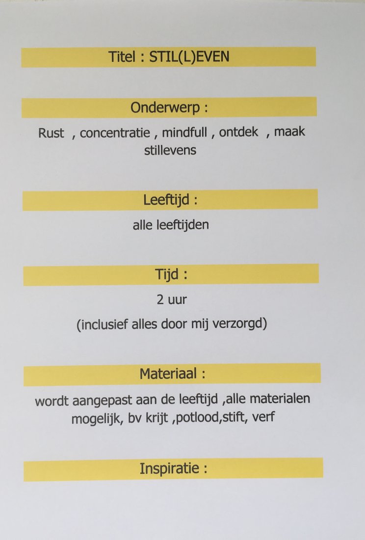 tijd : 2 uur : inclusief verzorging , voorbereiding , kunstles geven, opruimen en materiaal