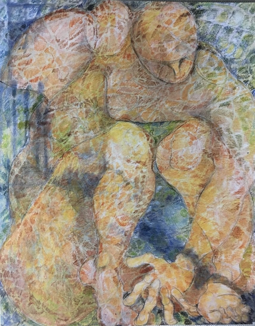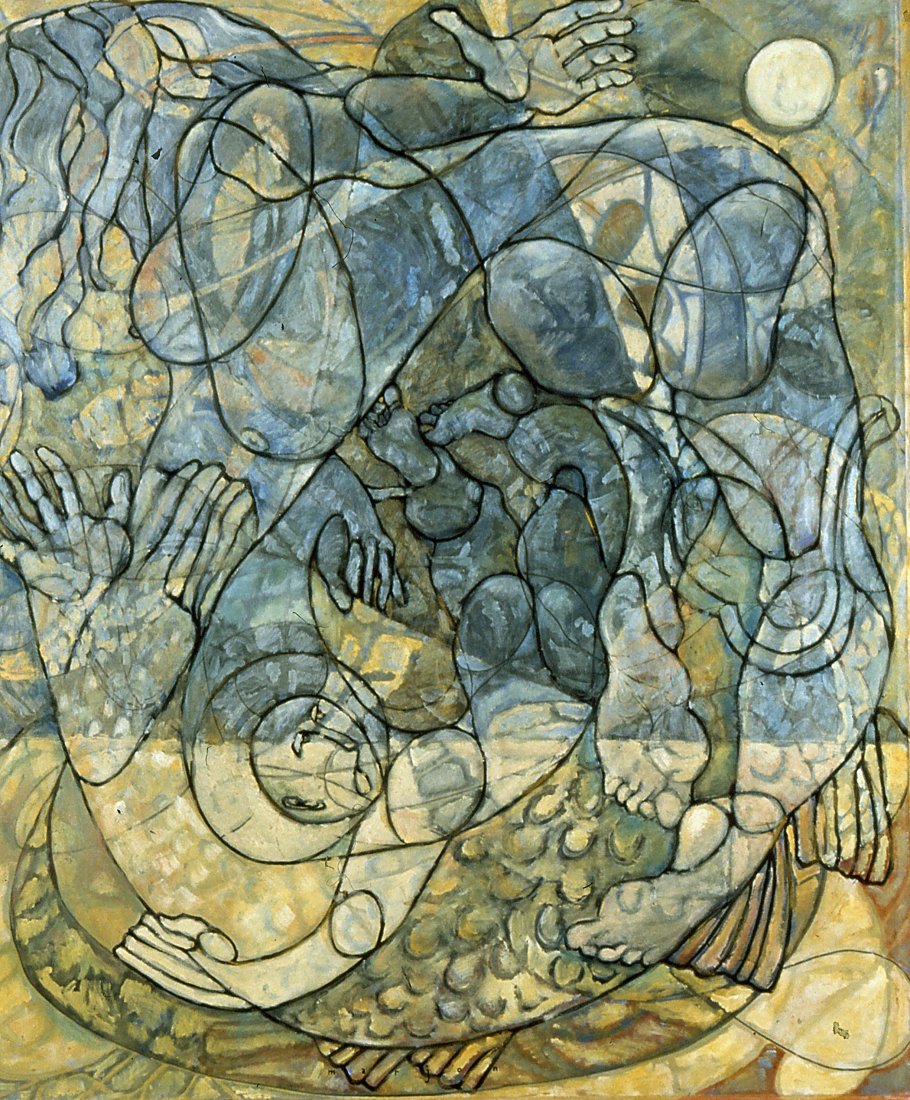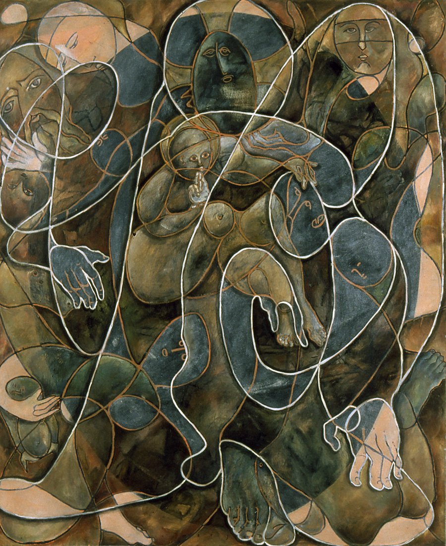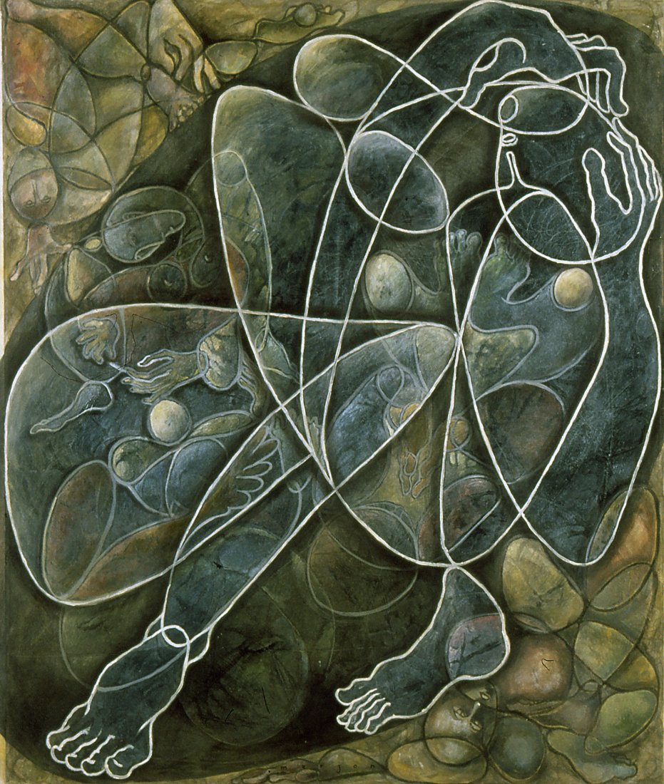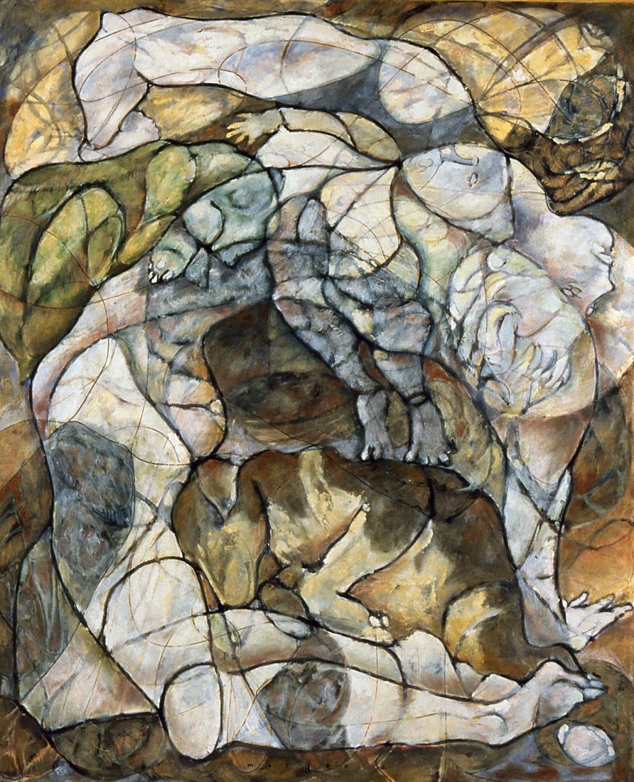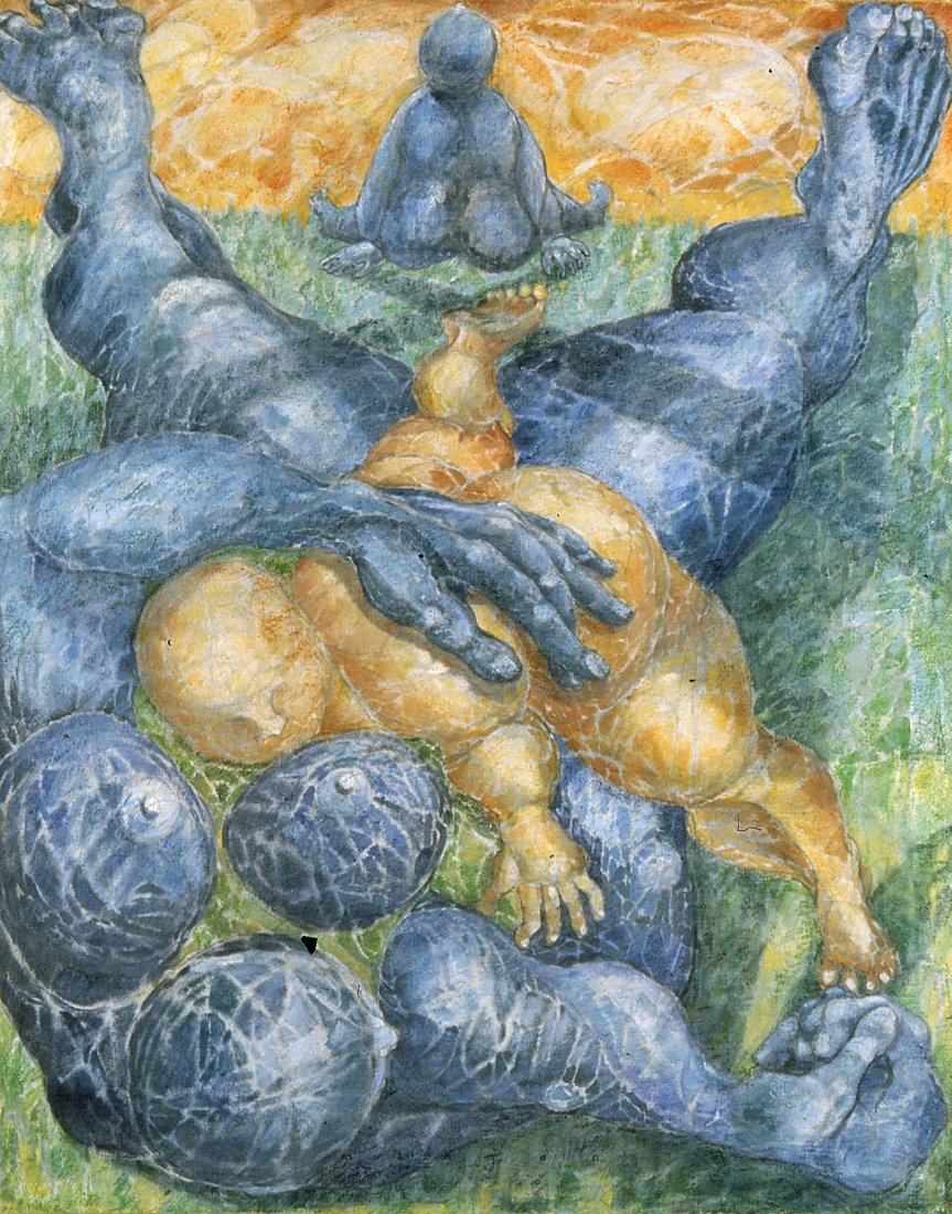 in the series of abstract paintings with the oval and round organic shapes the human body is still central, but it gets a strong radiation by the use of aquarellistic colours and compact shape.
