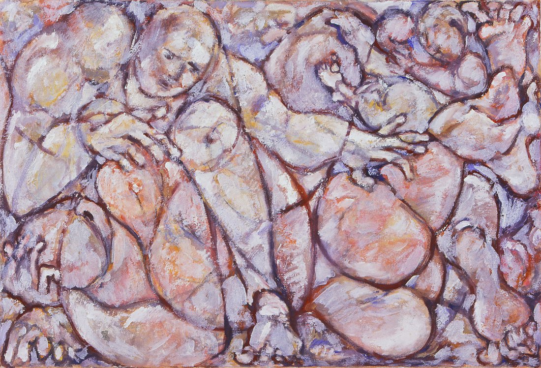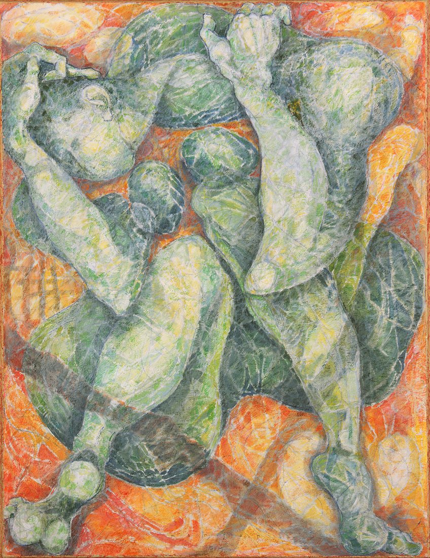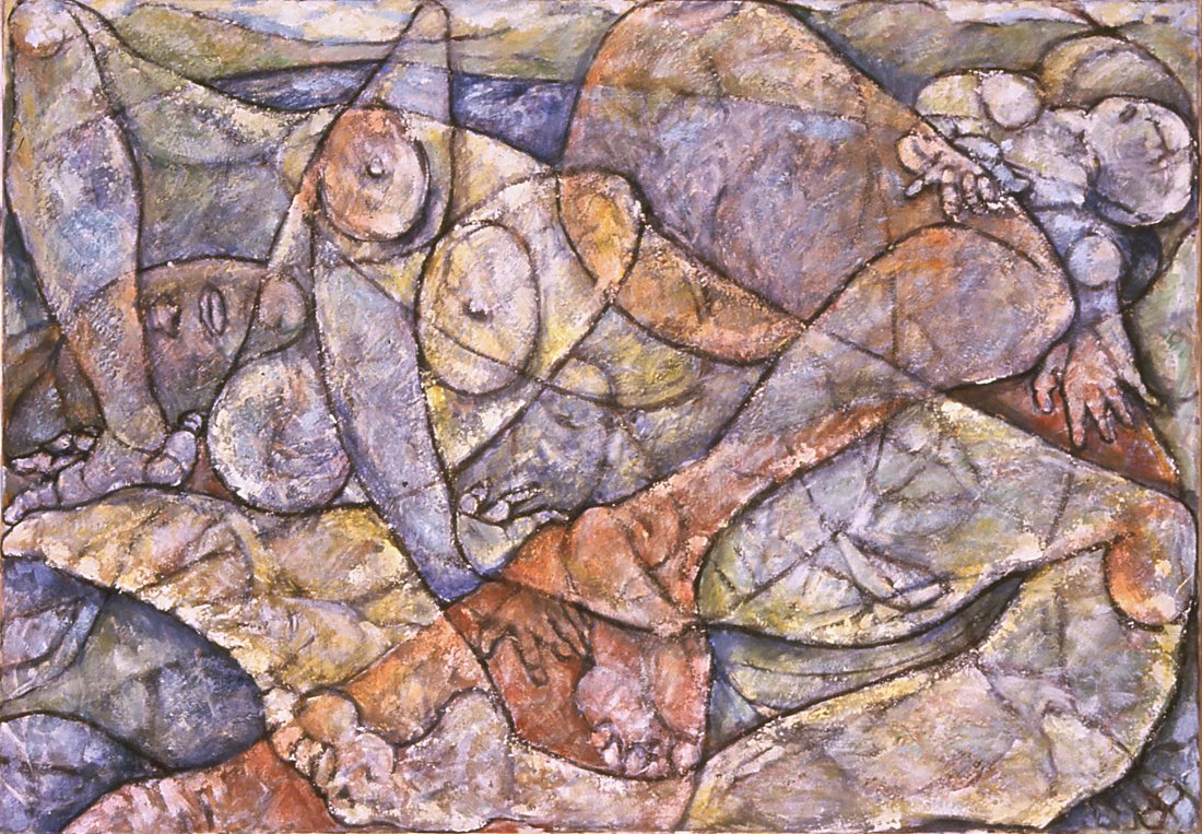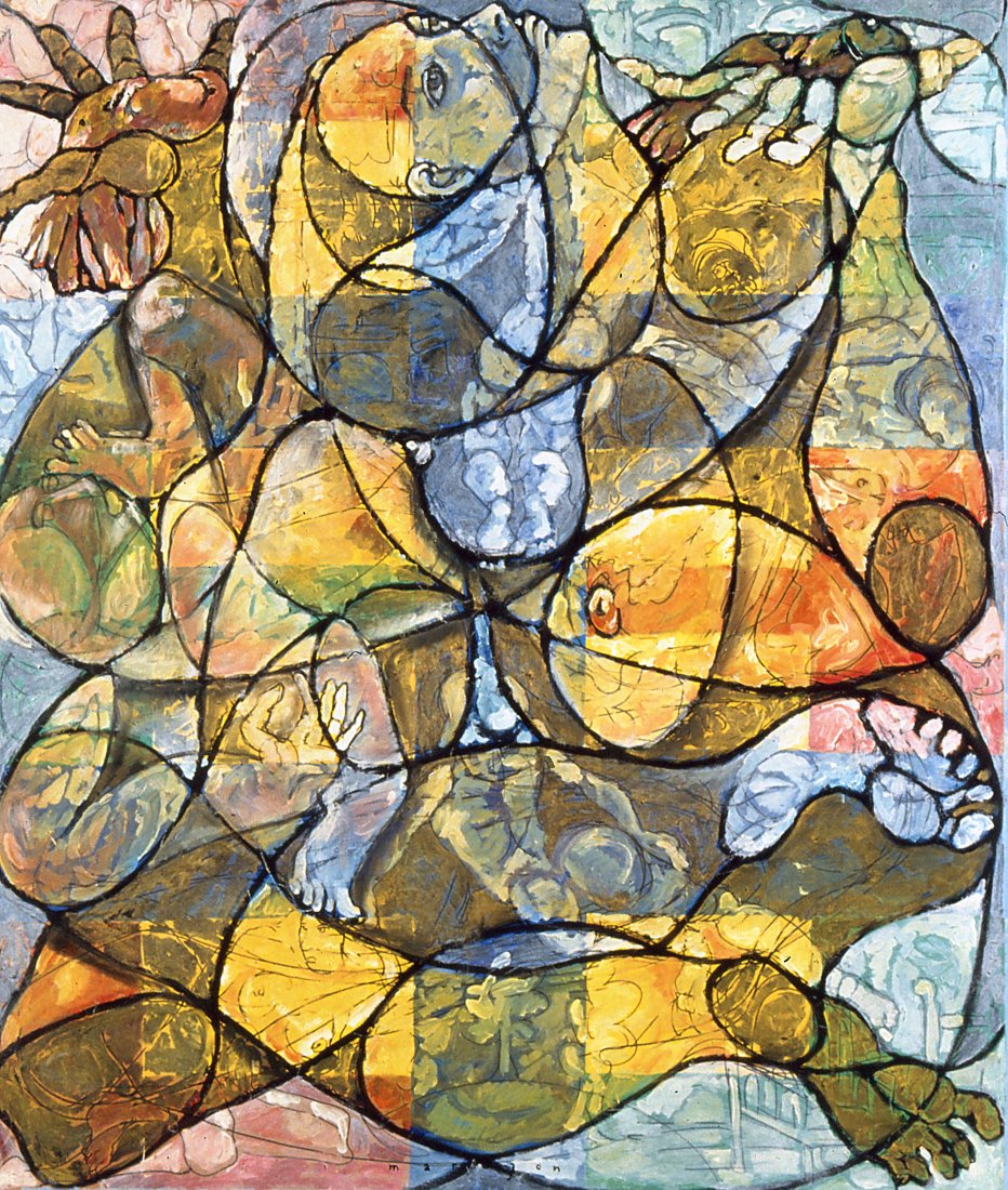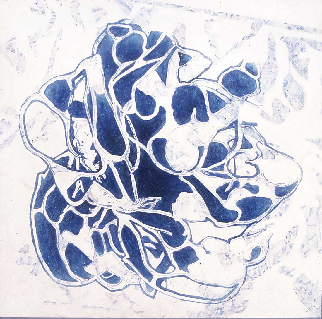 in the series of abstract paintings with the oval and round organic shapes the human body is still central, but it gets a strong radiation by the use of aquarellistic colours and compact shape.