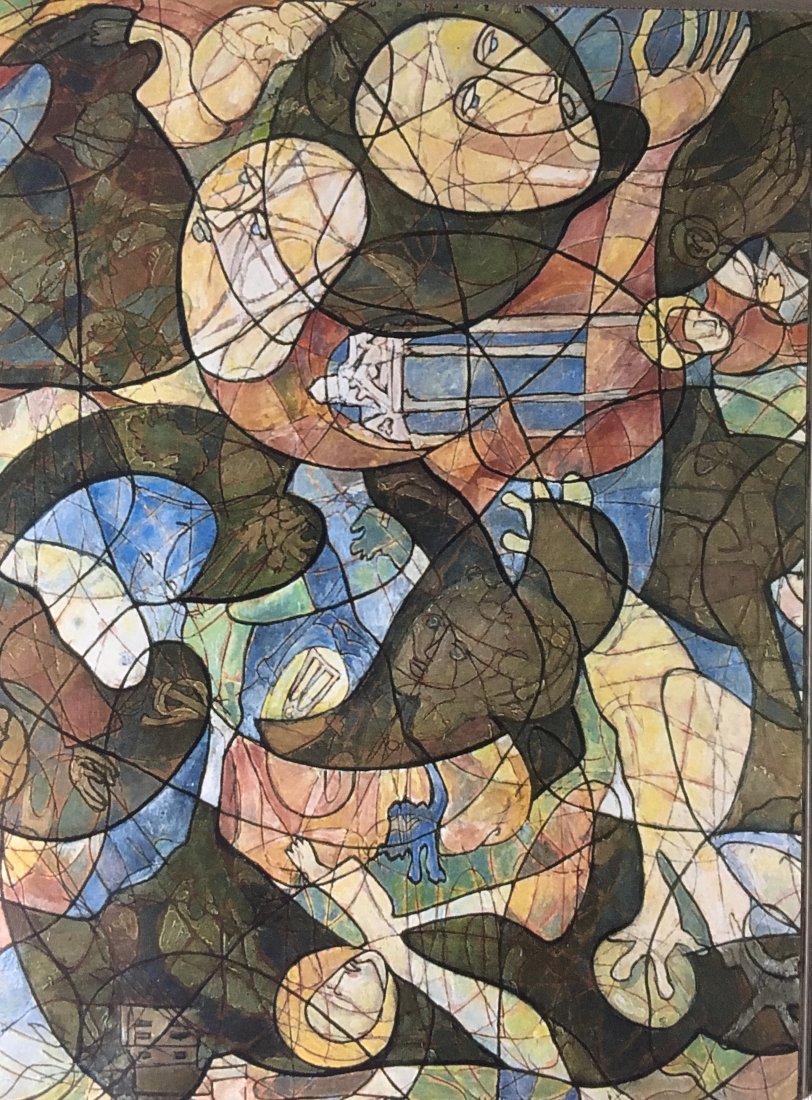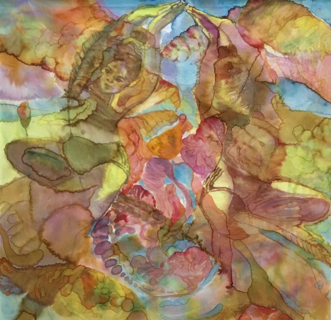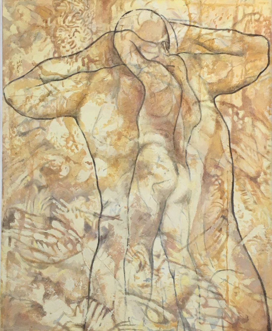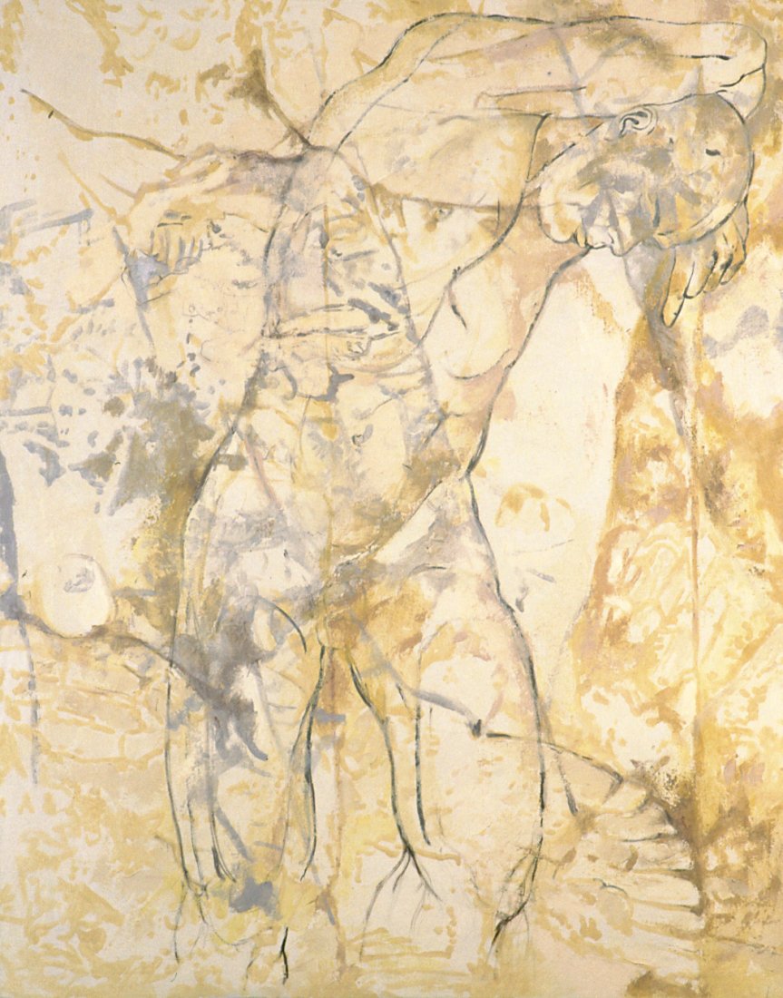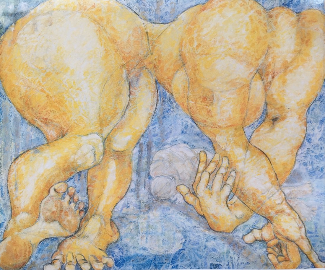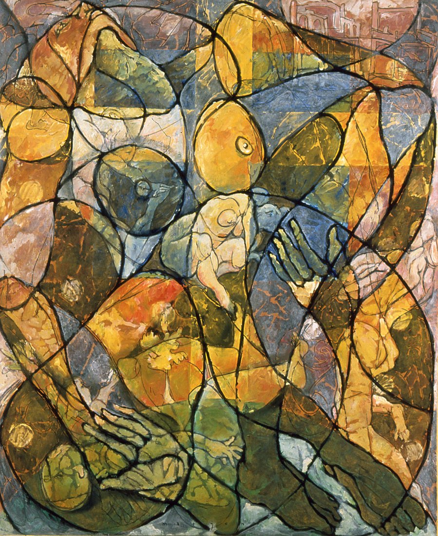 in the series of abstract paintings with the oval and round organic shapes the human body is still central, but it gets a strong radiation by the use of aquarellistic colours and compact shape.