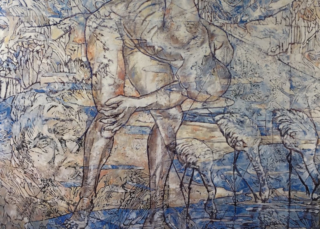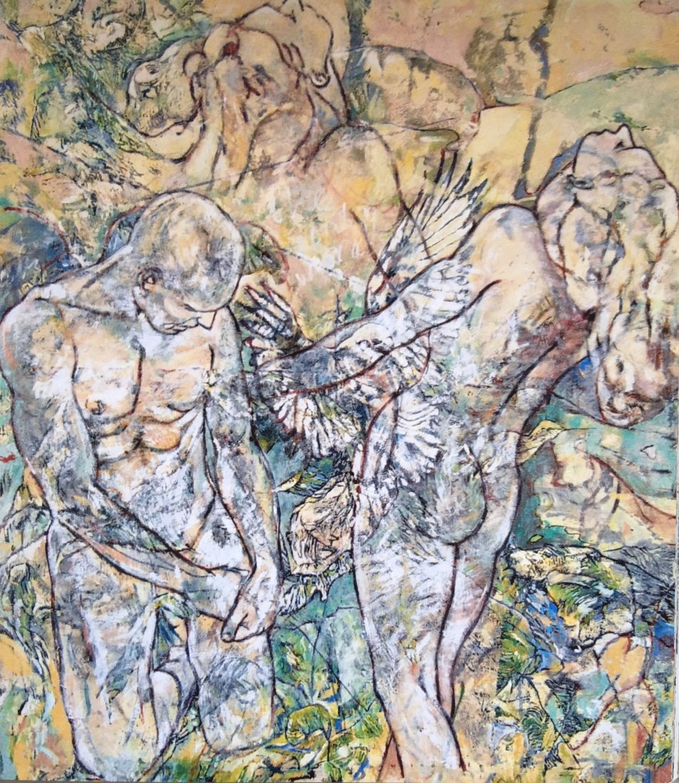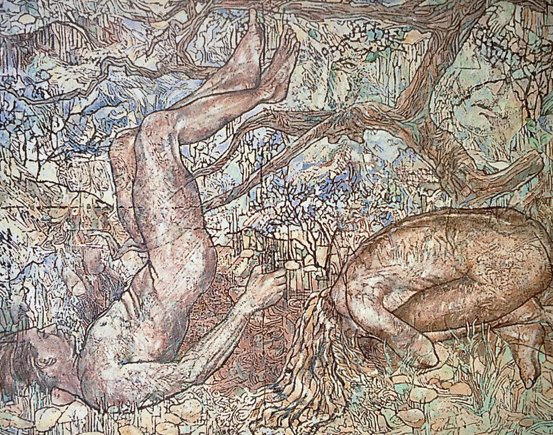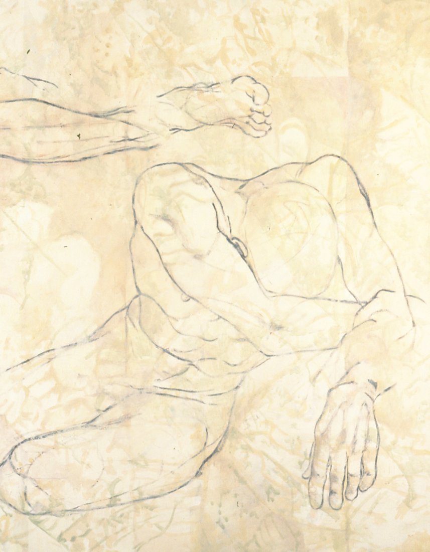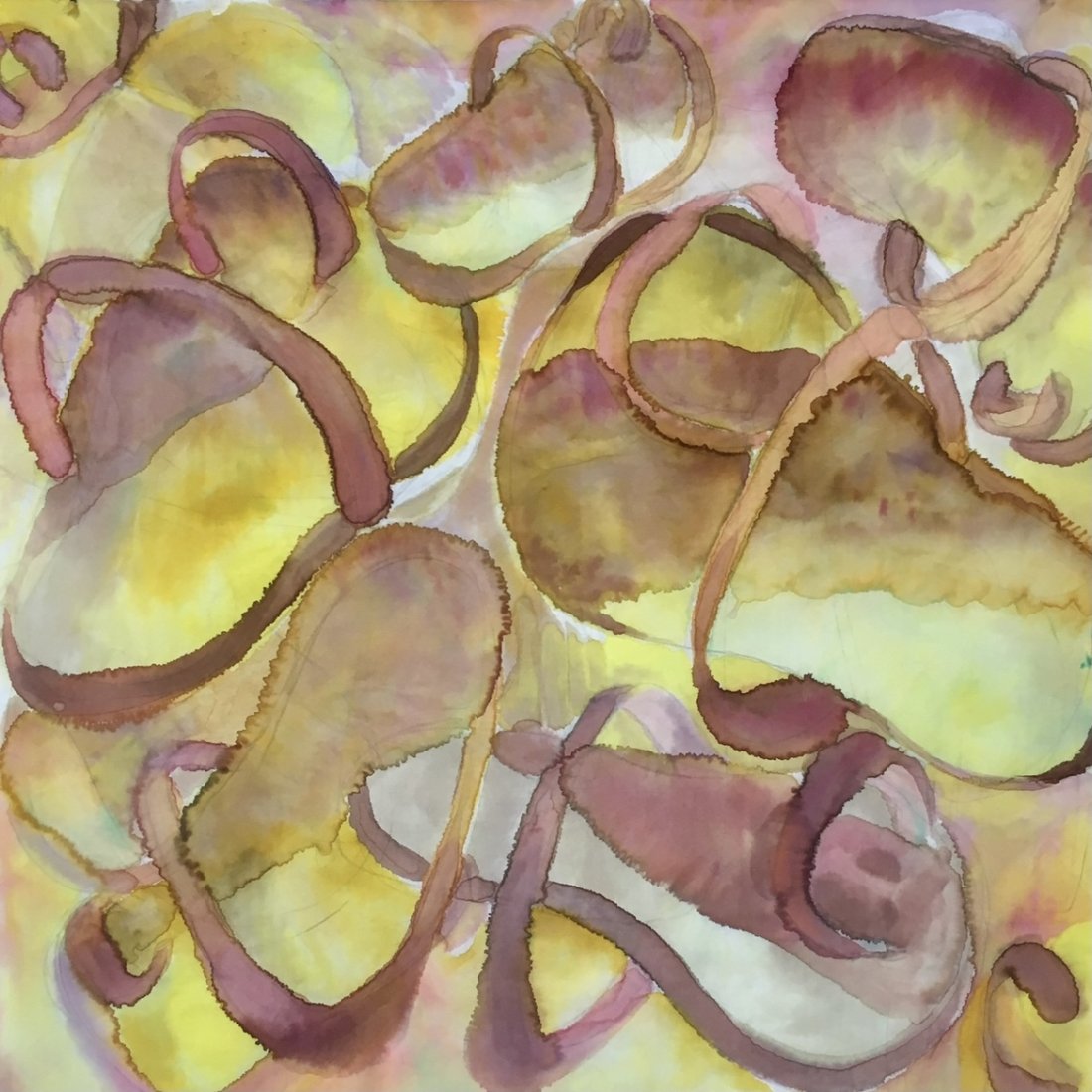 in the series of abstract paintings with the oval and round organic shapes the human body is still central, but it gets a strong radiation by the use of aquarellistic colours and compact shape.