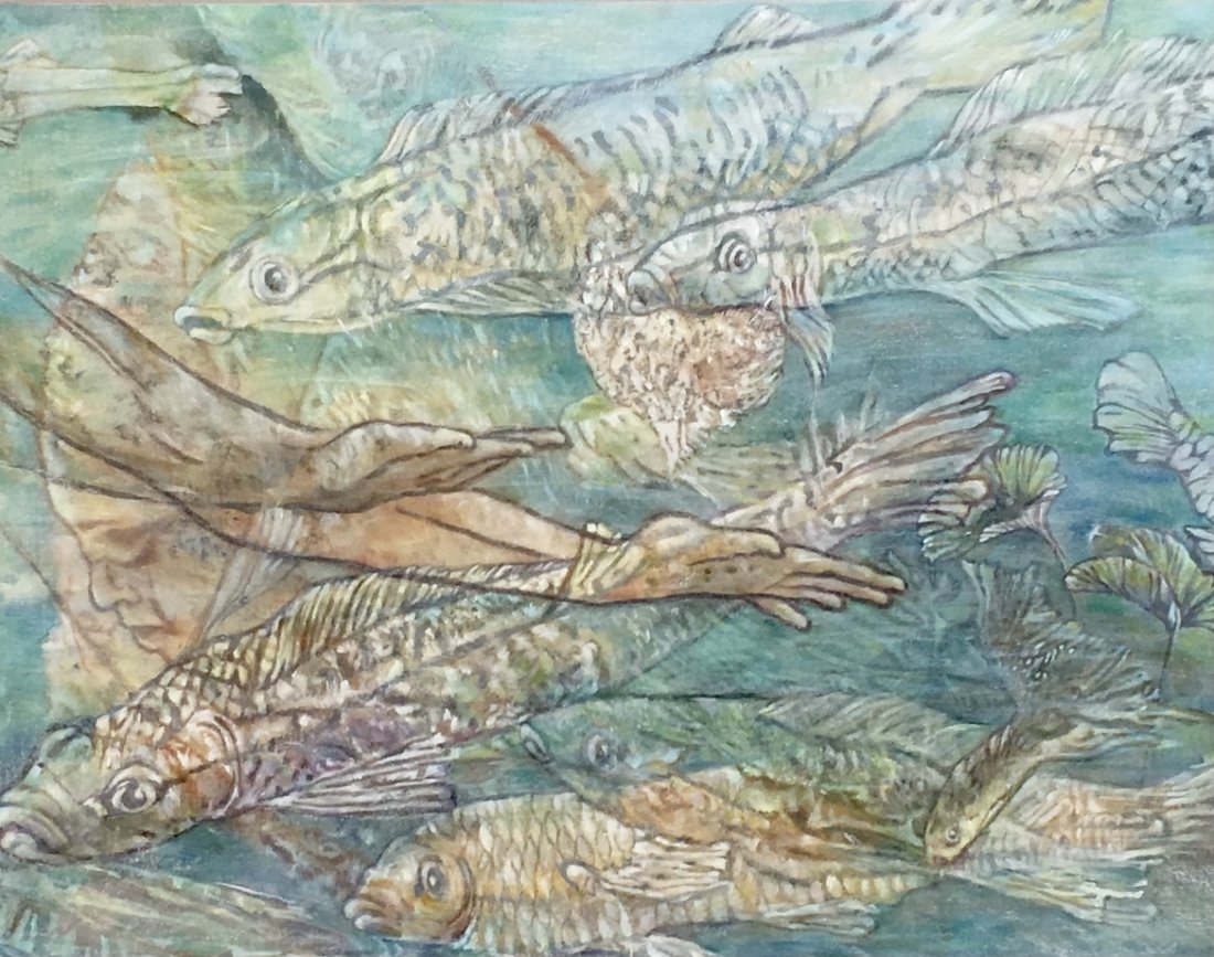 the bodies of women from which new life arises seem to float directly under a crystal clear watersurface shone upon by the sun.