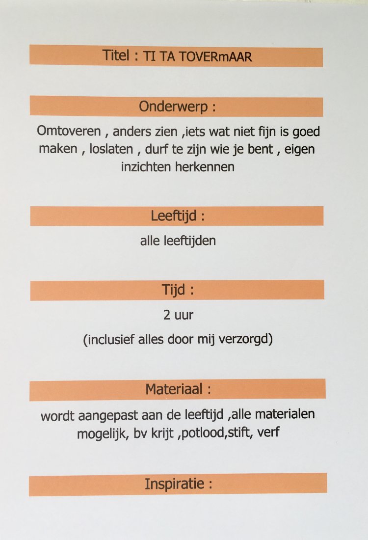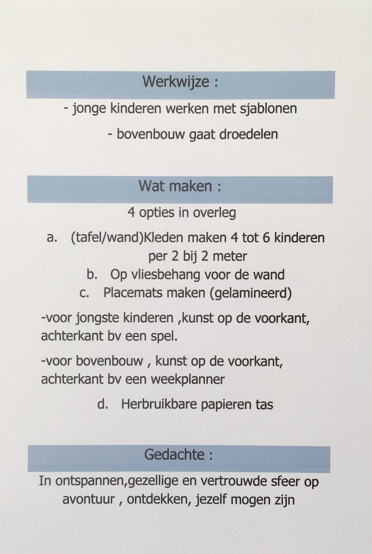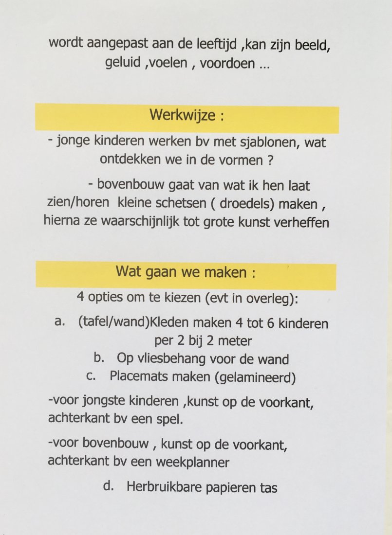 gedachte / werkwijze : inspirend materiaal , wat krijgen we mee, wat zouden we kunnen zijn ..., voorbeelden maken en aan de slag met het neergelegde matriaal , persoonlijke begeleiding