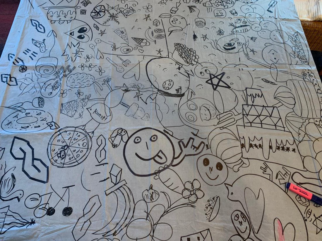 techniek : in overleg verf op zwartdoek of stift/krijt op karton / groot papier