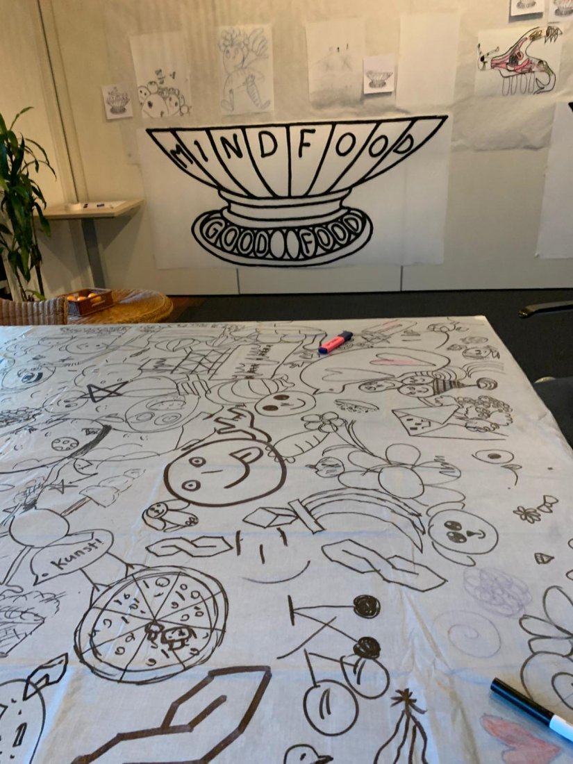 techniek : speciaal pastelkrijt op zwart papier of stift op rond karton , inspiratie via oa een grondtekening .. alles ligt klaar op de tafels , dus we kunnen onze ideeen gaan uitwerken .. ik loop steeds bij iedereen langs om te helpen met inzicht in hun eigen bijzondere beeldtaal zodat ze nieuwe wegen ontdekken