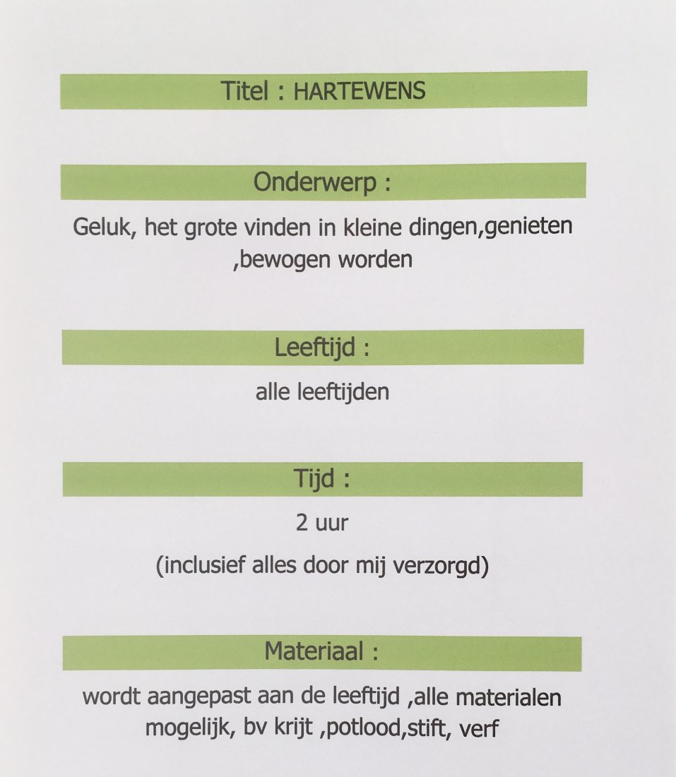 tijd : 2 uur : inclusief verzorging , voorbereiding , kunstles geven ,opruimen en materiaal
